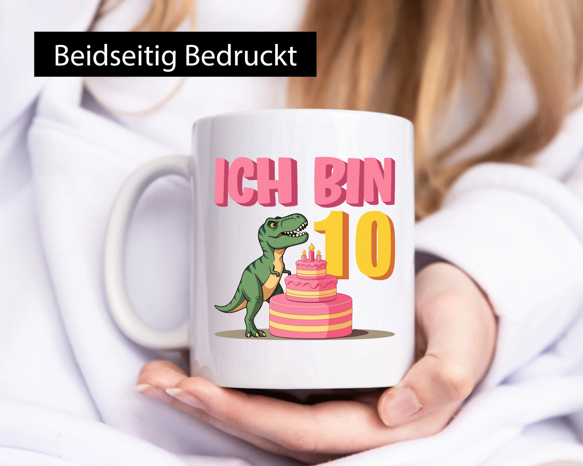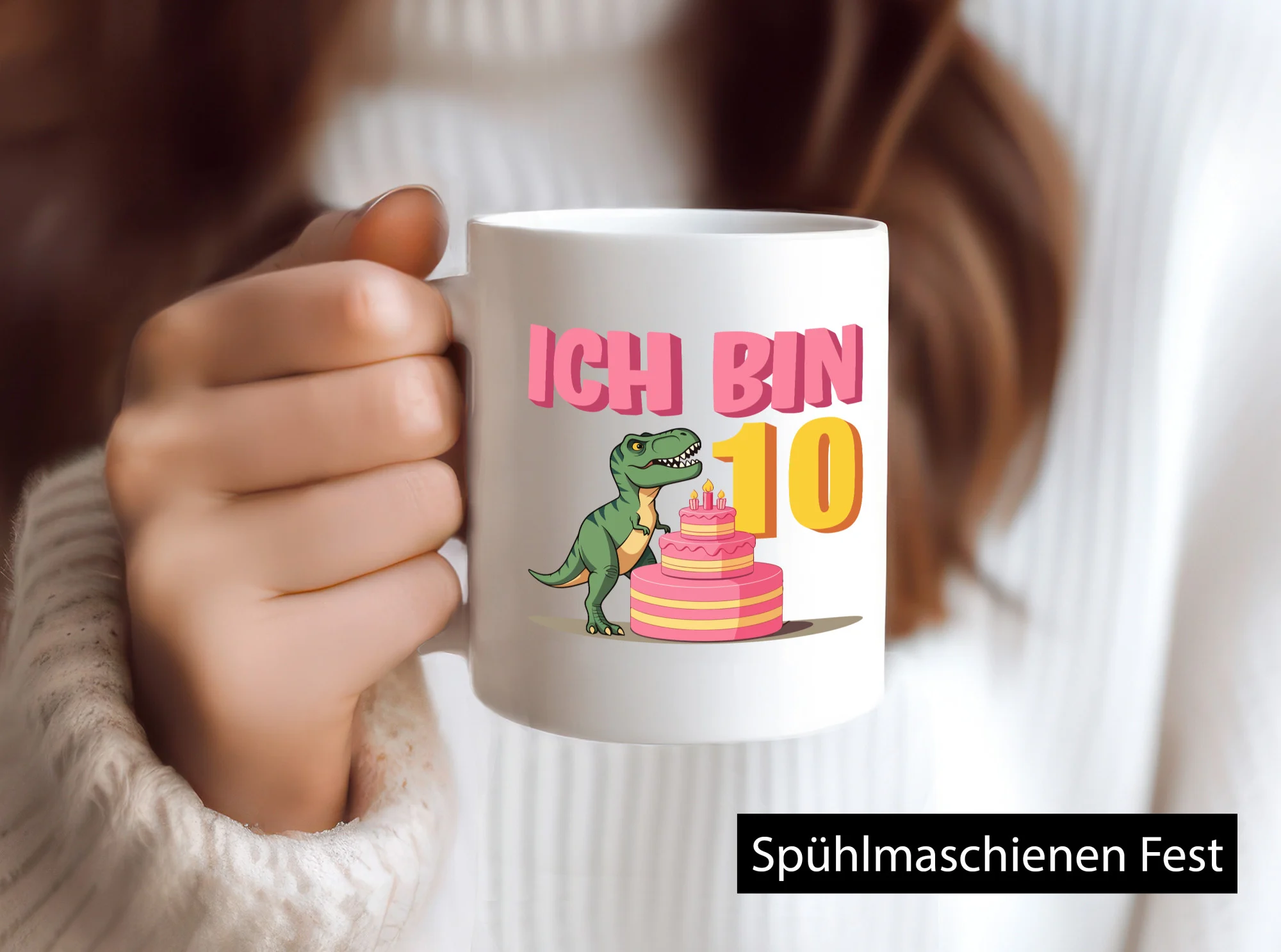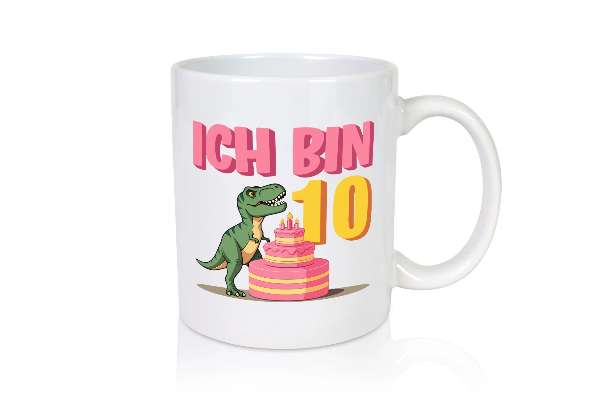 10 Geburtstag | 10 Jahre | Dinosaurier mit Kuchen – Tasse Weiß – Kaffeetasse / Geschenk / Familie
