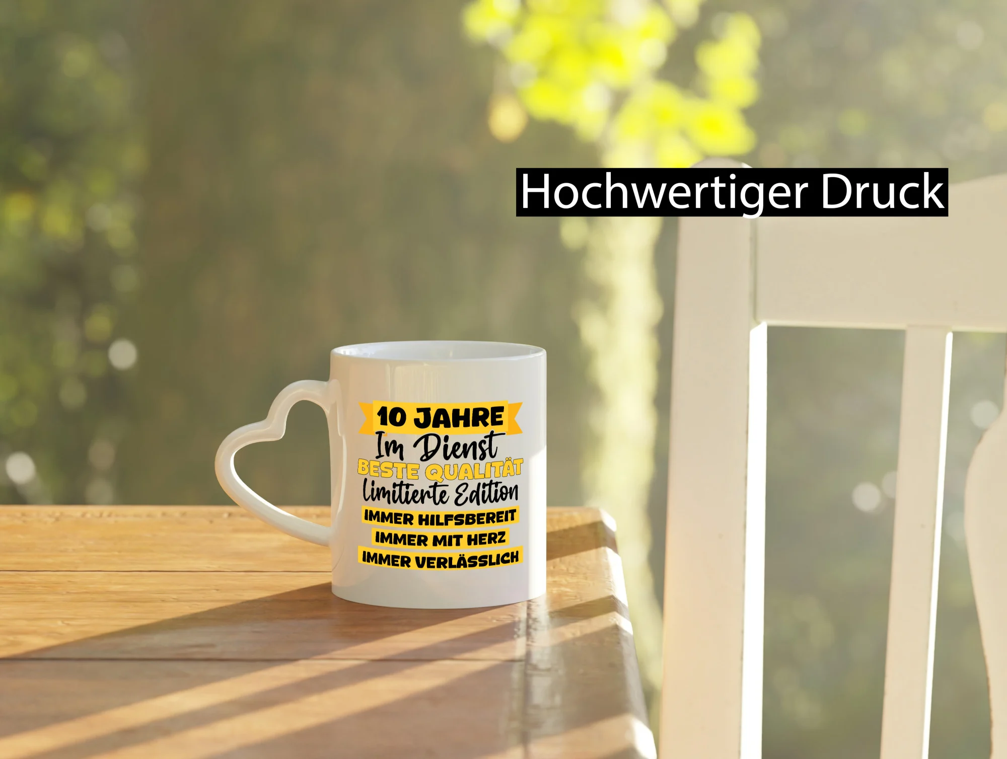 Die Tasse wird beidseitig in höchster Farbbrillanz bedruckt, sodass sie sowohl für Links- als auch Rechtshänder ideal geeignet ist. Der großzügige Henkel in Herz-Form liegt angenehm in der Hand und sorgt auch dann für einen festen Halt, wenn die Tasse befüllt ist. So lässt sich das wärmende Heißgetränk in aller Ruhe genießen.