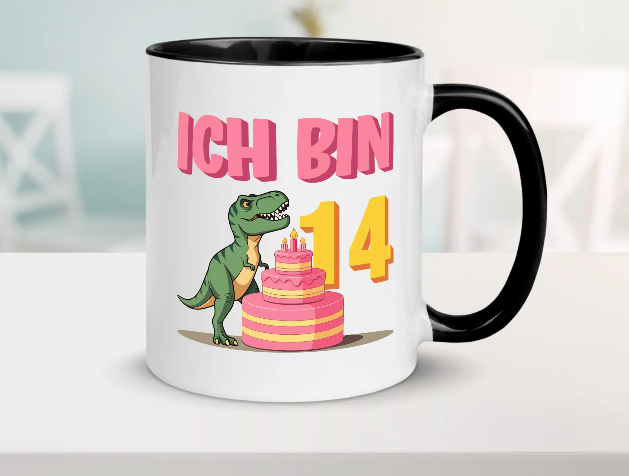 14 Geburtstag | 14 Jahre | Dinosaurier mit Kuchen Farbige Tasse – Kaffeetasse / Geschenk / Familie