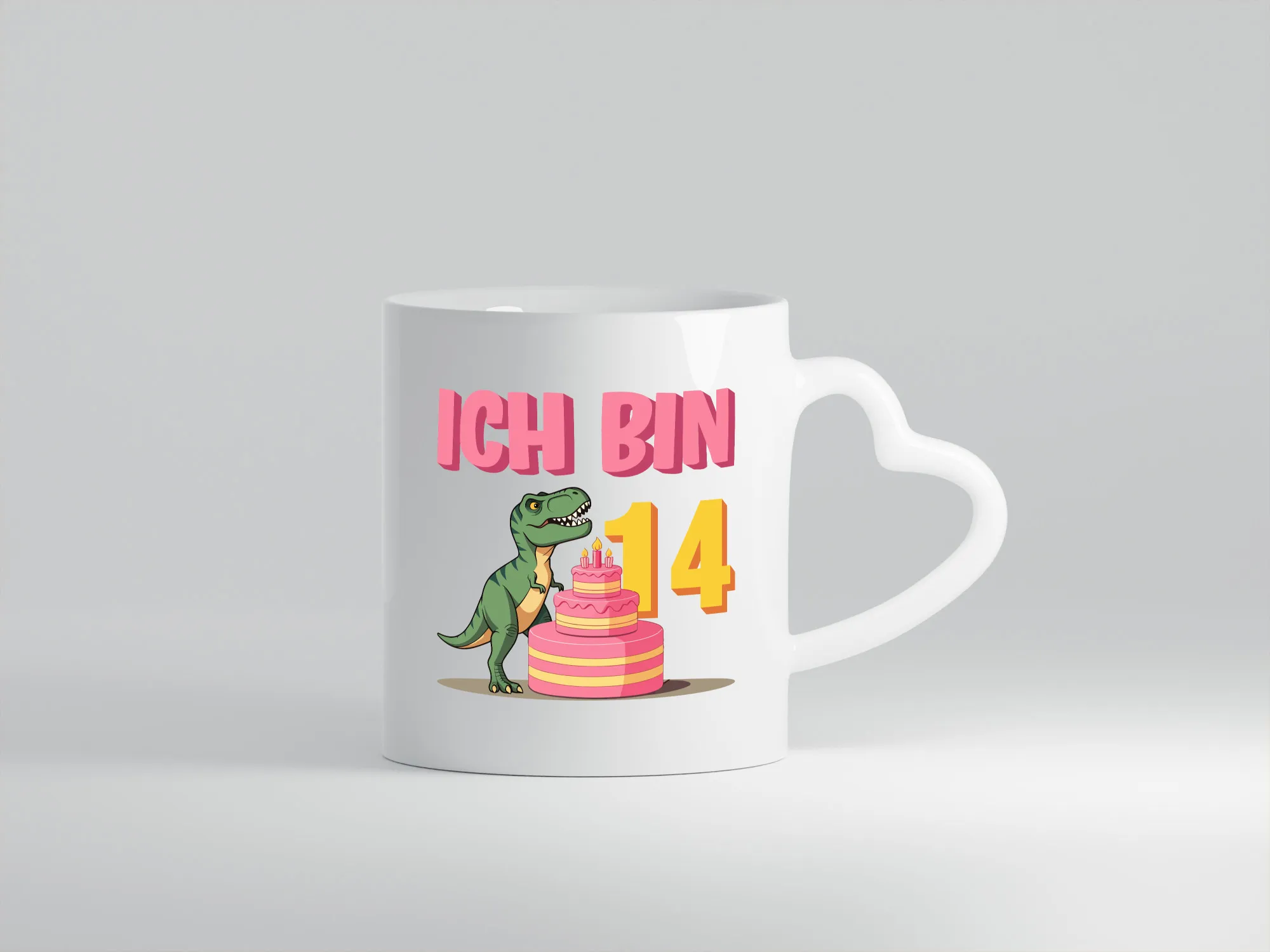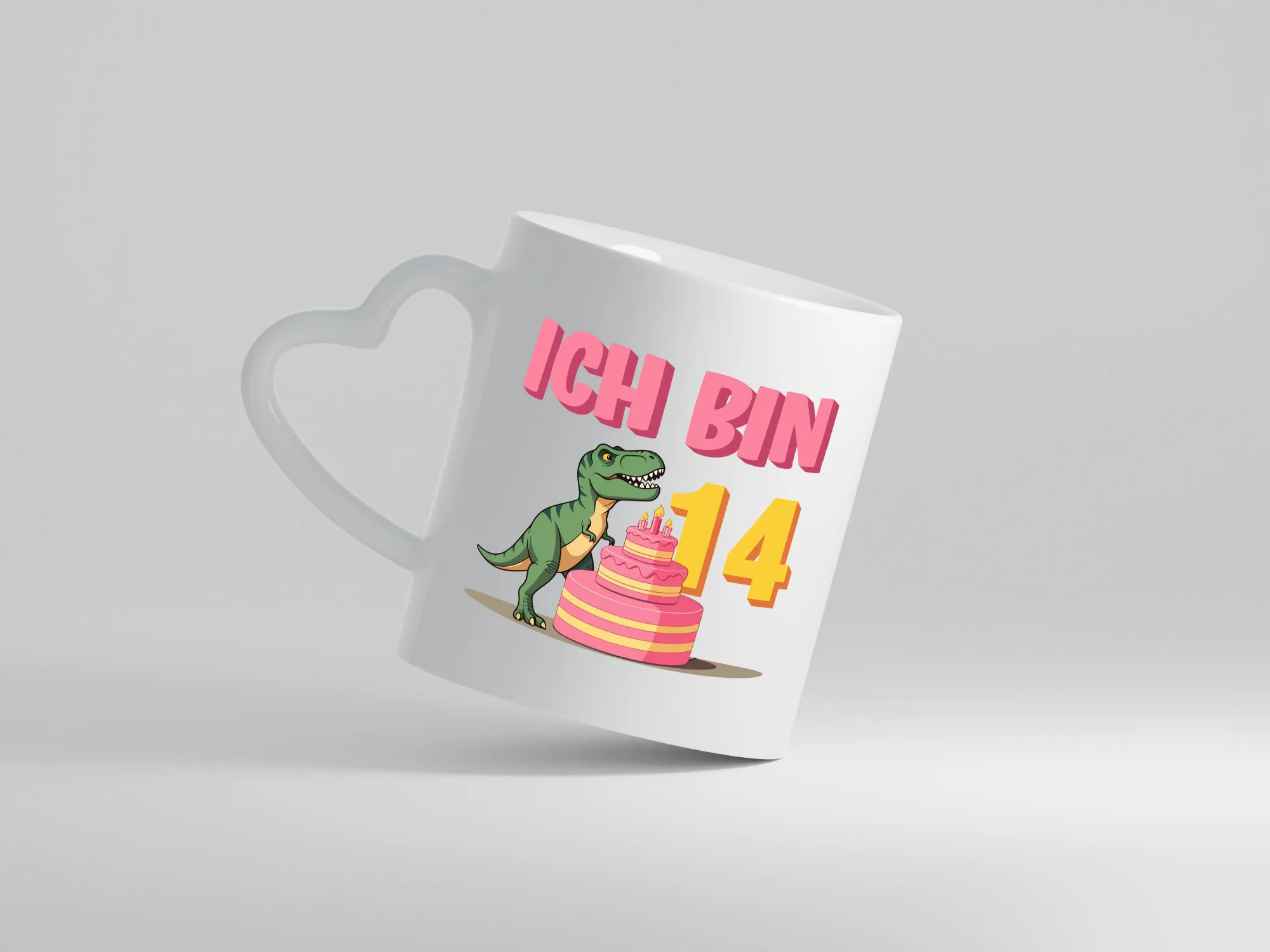 14 Geburtstag | 14 Jahre | Dinosaurier mit Kuchen – Herzhenkel Tasse – Kaffeetasse / Geschenk / Familie