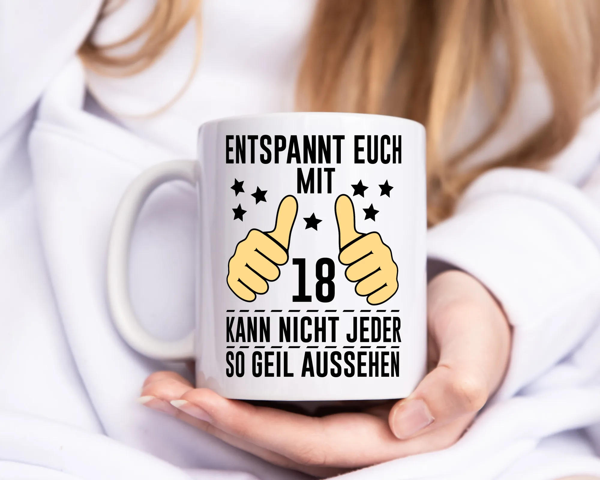 18. Geburtstag | 18 Jahre | Geil aussehen | Entspannt euch – Tasse Weiß – Kaffeetasse / Geschenk / Familie