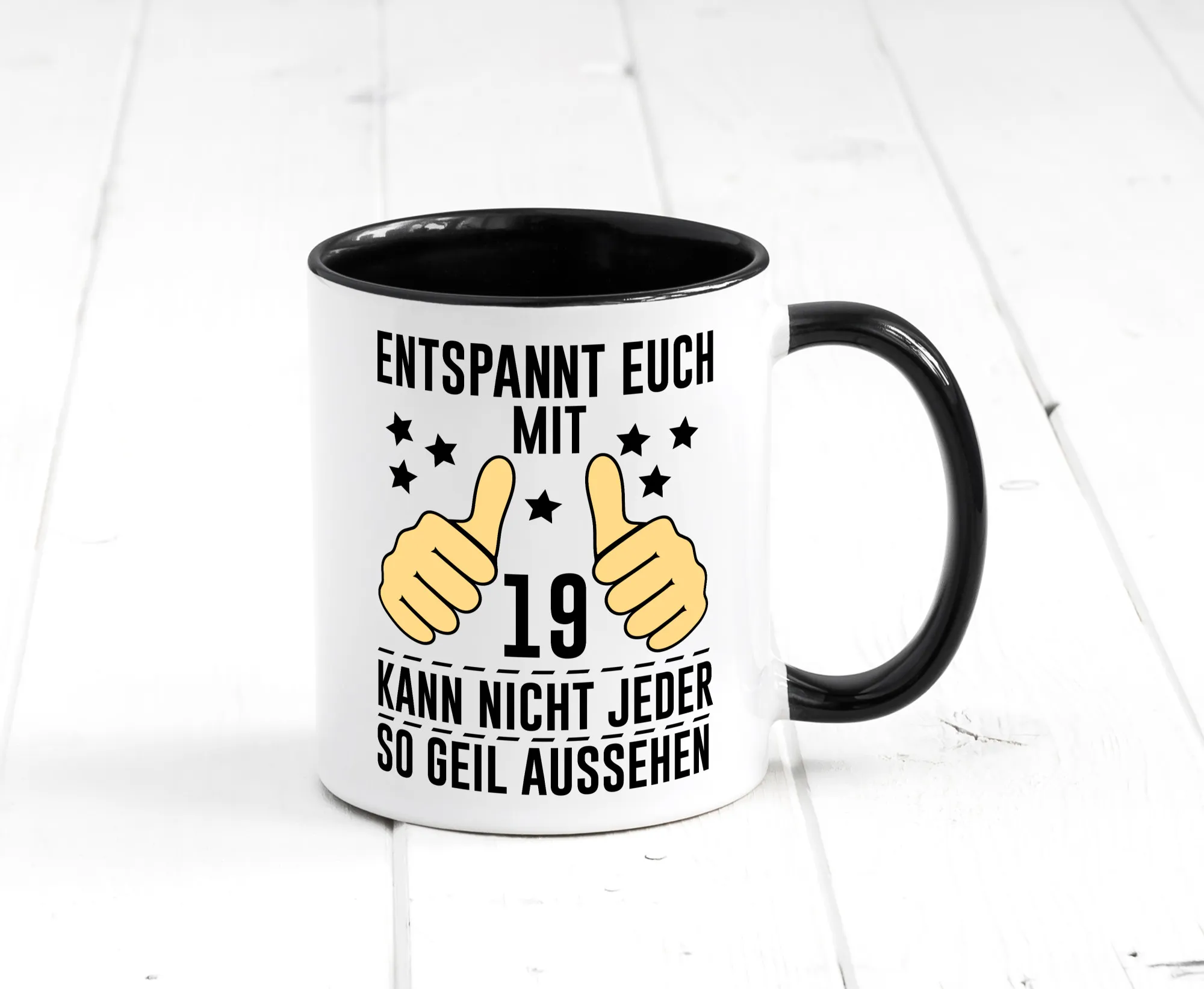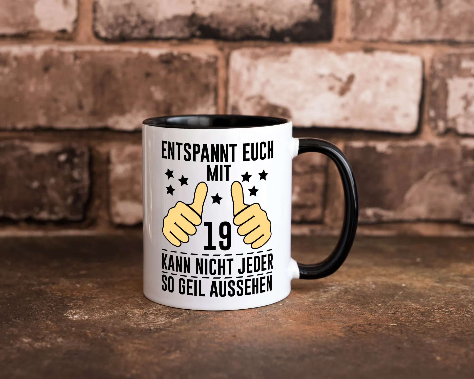 19. Geburtstag | 19 Jahre | Geil aussehen | Entspannt euch v2 Farbige Tasse – Kaffeetasse / Geschenk / Familie