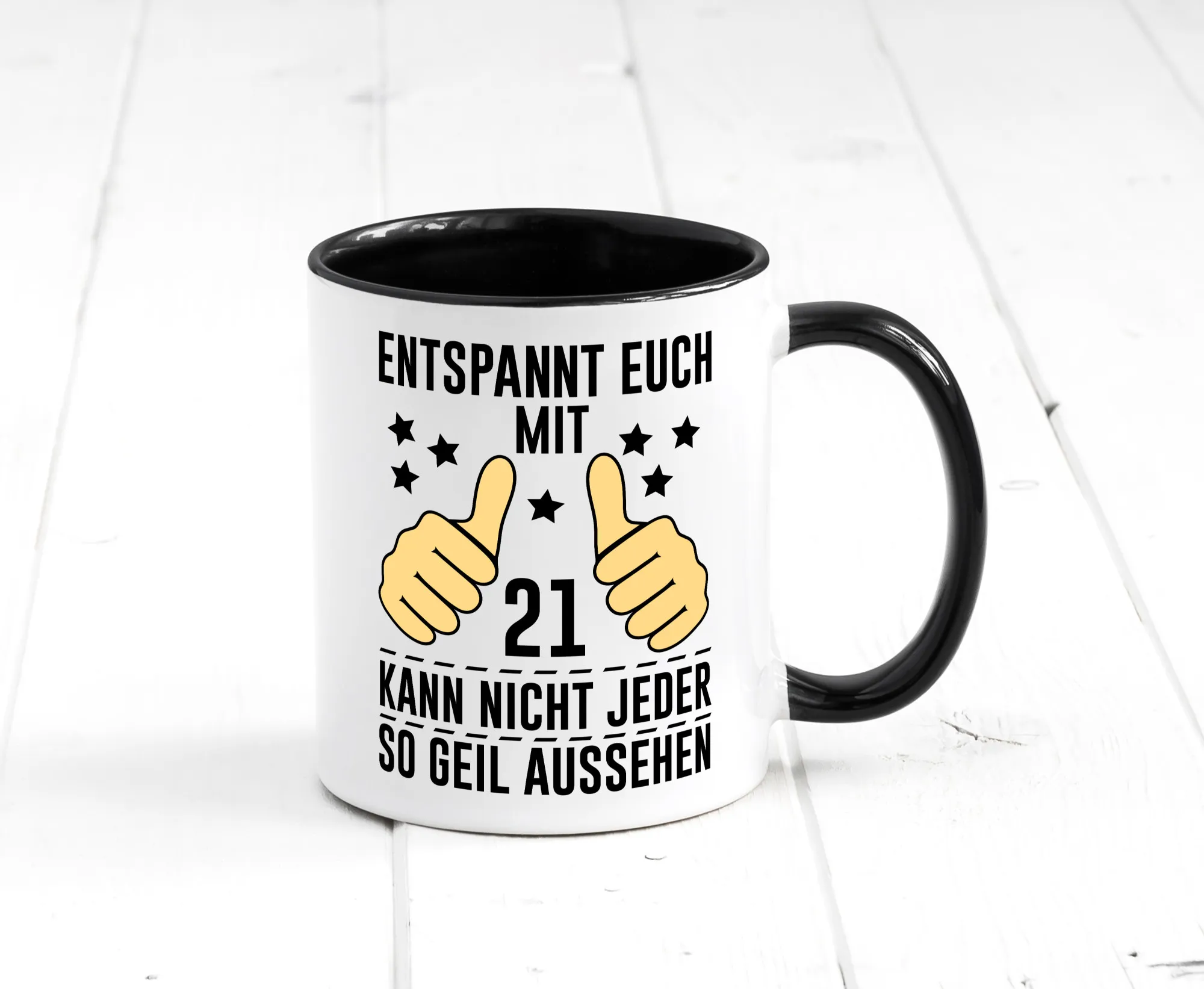 21. Geburtstag | 21 Jahre | Geil aussehen | Entspannt euch v2 Farbige Tasse – Kaffeetasse / Geschenk / Familie