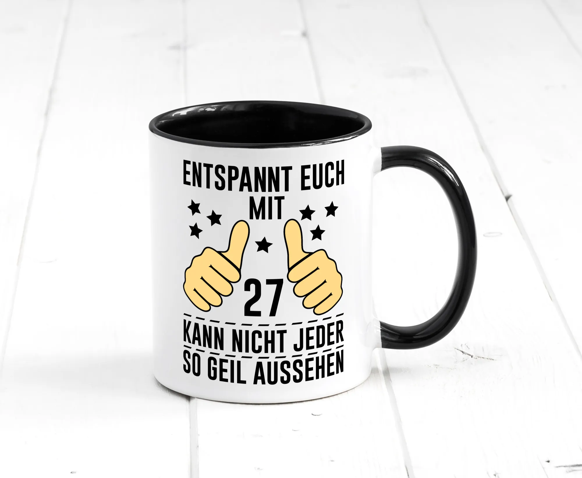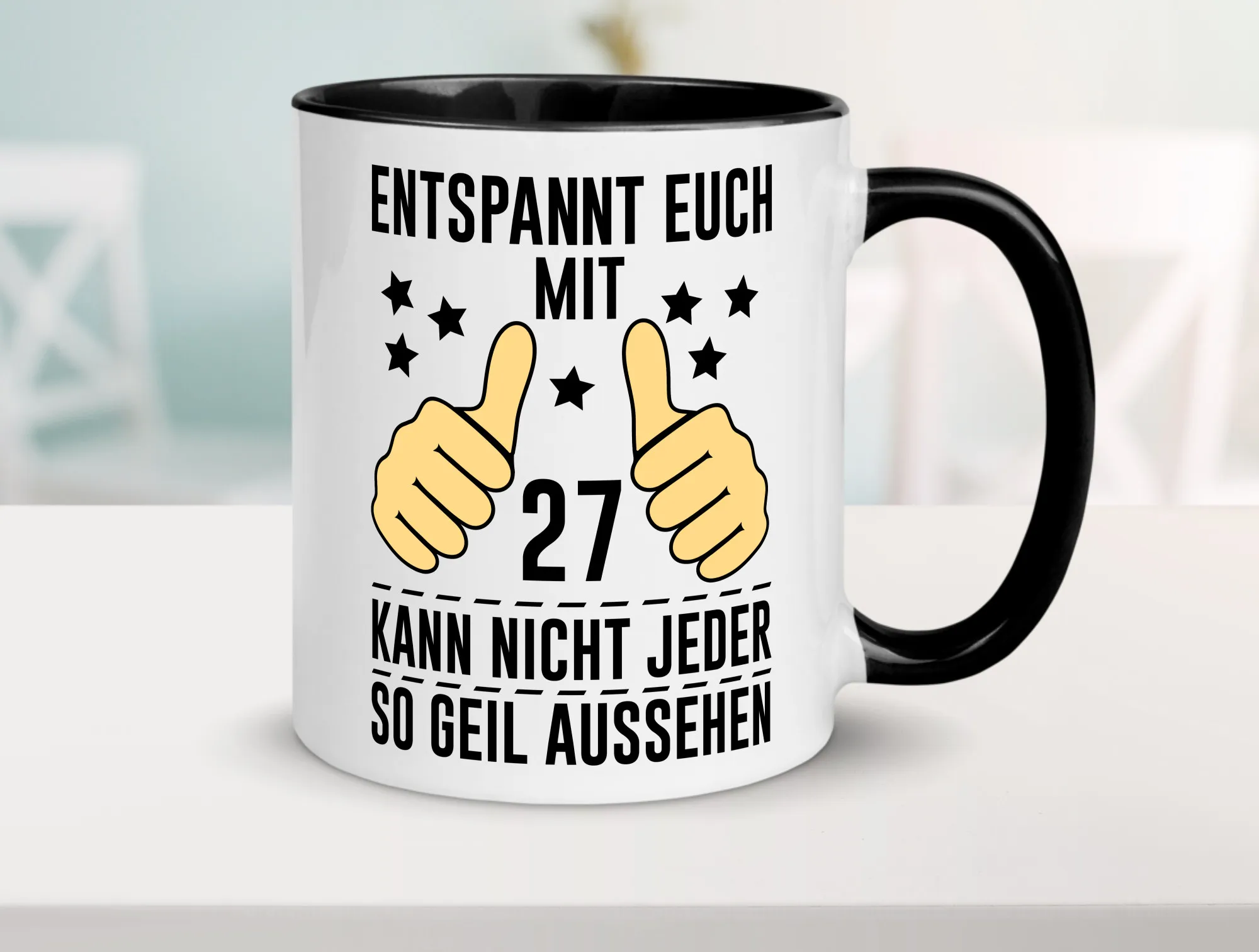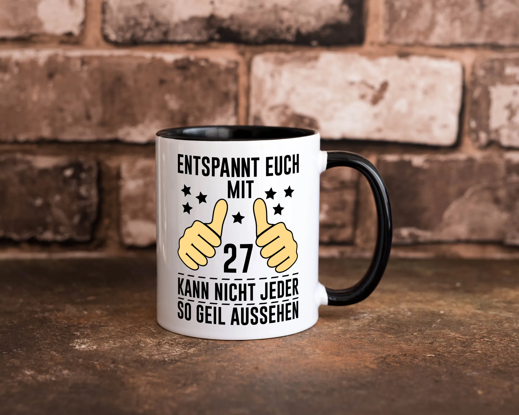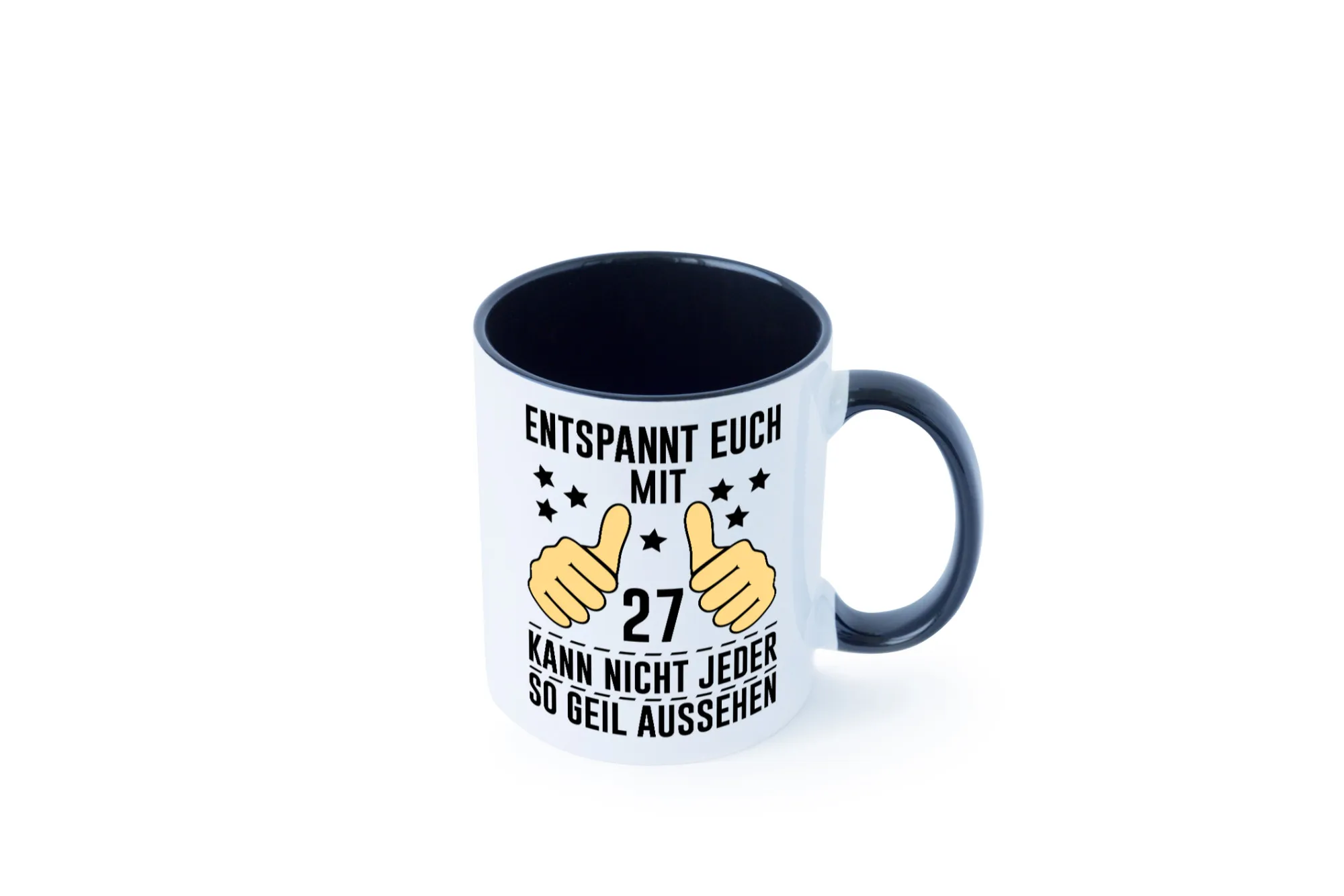 27. Geburtstag | 27 Jahre | Geil aussehen | Entspannt euch v2 Farbige Tasse – Kaffeetasse / Geschenk / Familie