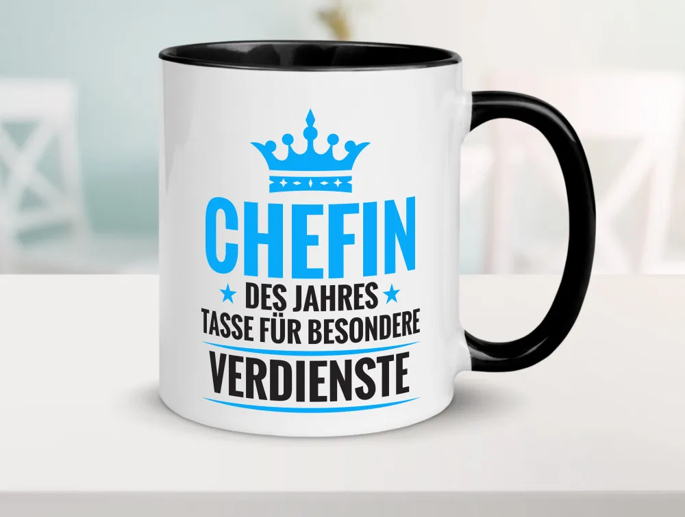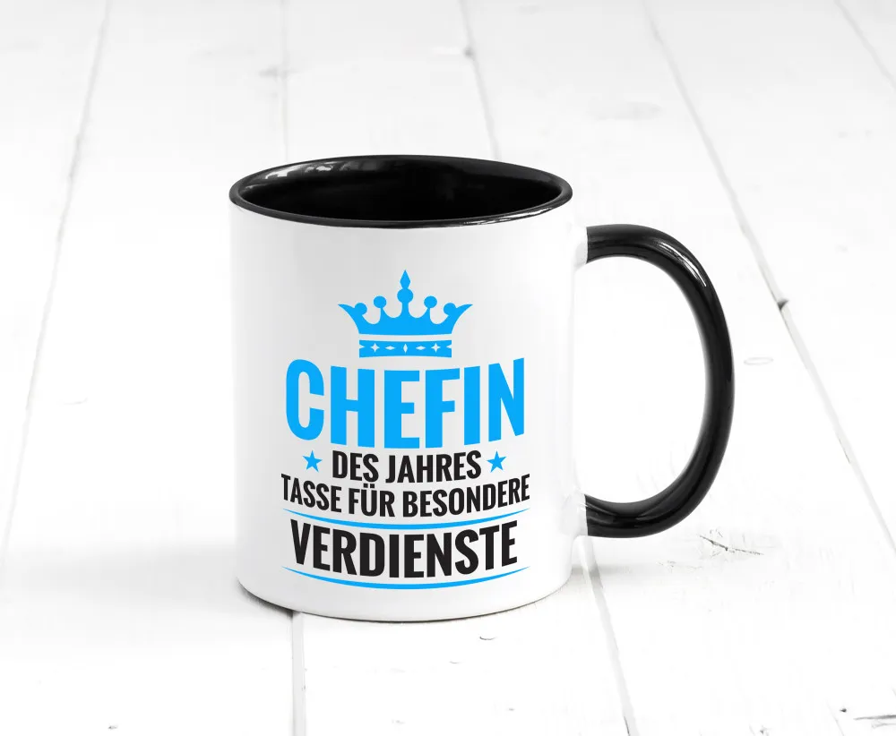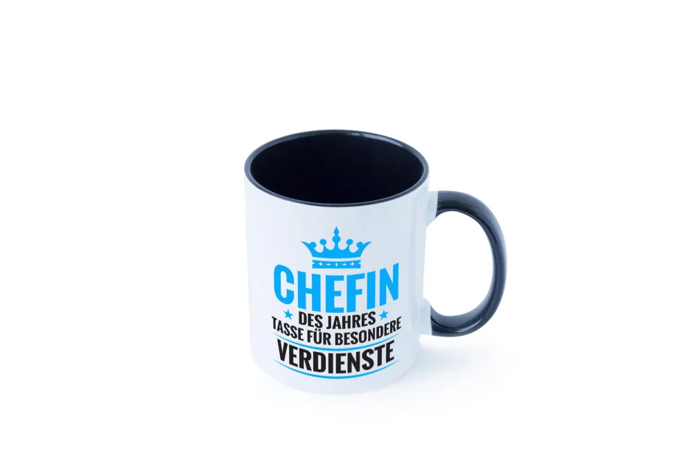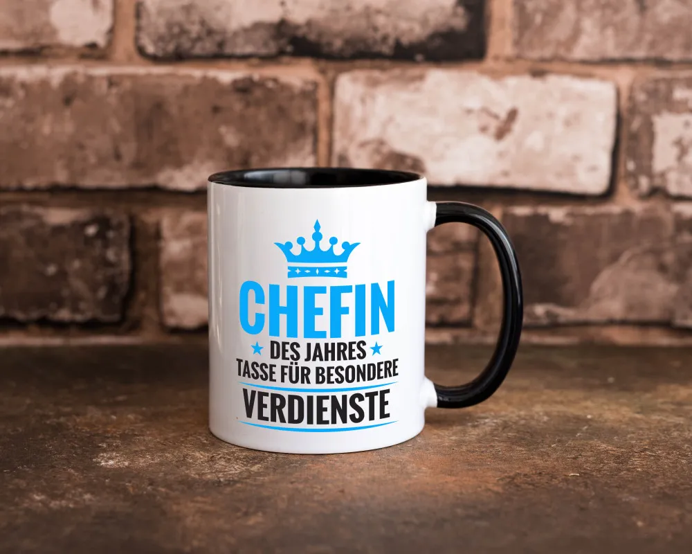 Besonderer Verdienst: Chefin | Führungskraft | Vorgesetzte Farbige Tasse – Kaffeetasse / Geschenk / Familie