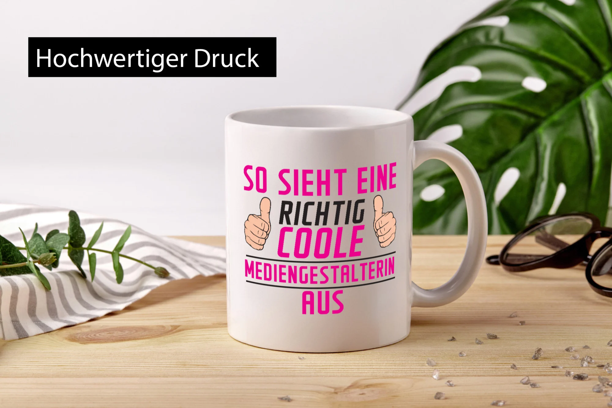 Die Tasse wird beidseitig in höchster Farbbrillanz bedruckt, sodass sie sowohl für Links- als auch Rechtshänder ideal geeignet ist. Der großzügige Henkel in C-Form liegt angenehm in der Hand und sorgt auch dann für einen festen Halt, wenn die Tasse befüllt ist. So lässt sich das wärmende Heißgetränk in aller Ruhe genießen.