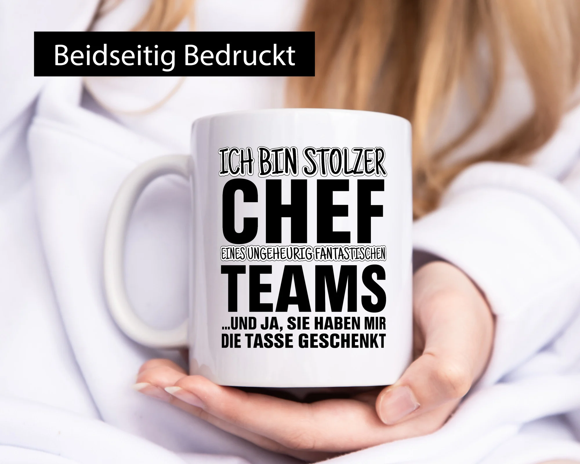 Die Tasse wird beidseitig in höchster Farbbrillanz bedruckt, sodass sie sowohl für Links- als auch Rechtshänder ideal geeignet ist. Der großzügige Henkel in C-Form liegt angenehm in der Hand und sorgt auch dann für einen festen Halt, wenn die Tasse befüllt ist. So lässt sich das wärmende Heißgetränk in aller Ruhe genießen.