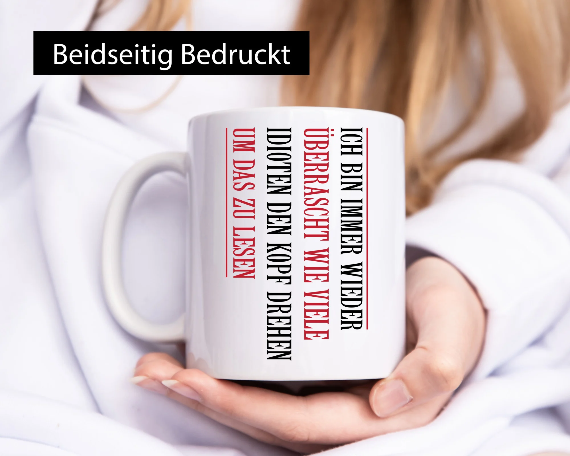 Die Tasse wird beidseitig in höchster Farbbrillanz bedruckt, sodass sie sowohl für Links- als auch Rechtshänder ideal geeignet ist. Der großzügige Henkel in C-Form liegt angenehm in der Hand und sorgt auch dann für einen festen Halt, wenn die Tasse befüllt ist. So lässt sich das wärmende Heißgetränk in aller Ruhe genießen.