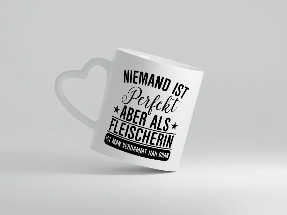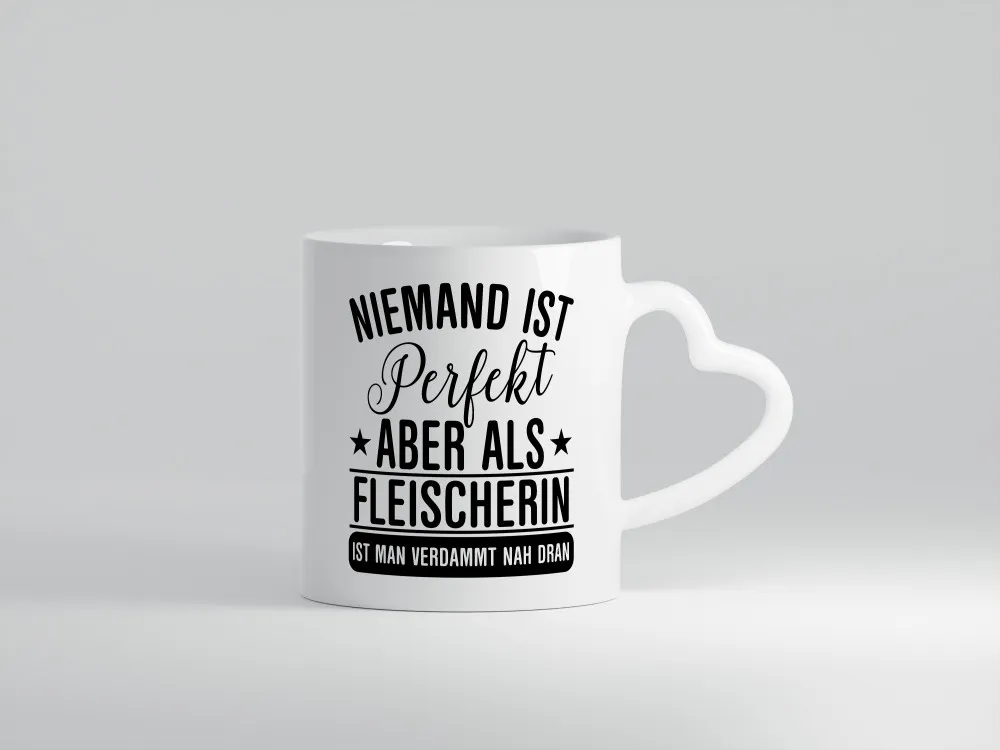 Verdammt nah dran: Fleischerin | Schlachterei – Herzhenkel Tasse – Kaffeetasse / Geschenk / Familie