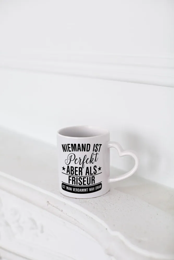 Verdammt nah dran: Friseur | Frisör – Herzhenkel Tasse – Kaffeetasse / Geschenk / Familie