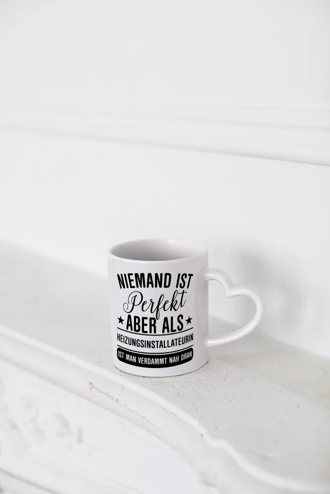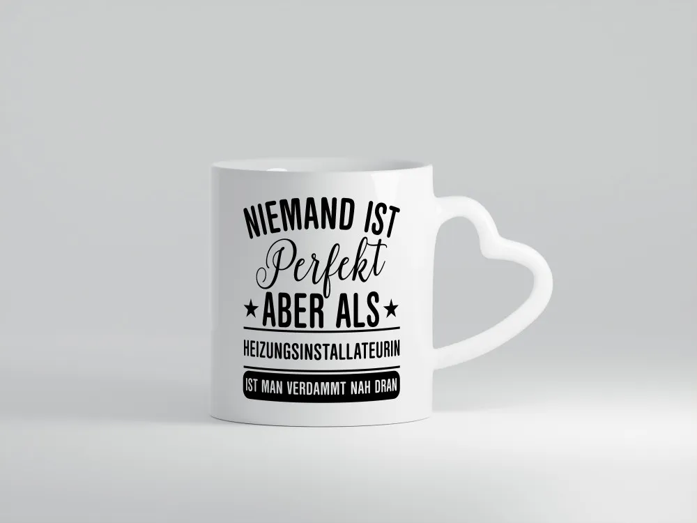 Verdammt nah dran: Heizungsinstallateurin | Heizung – Herzhenkel Tasse – Kaffeetasse / Geschenk / Familie