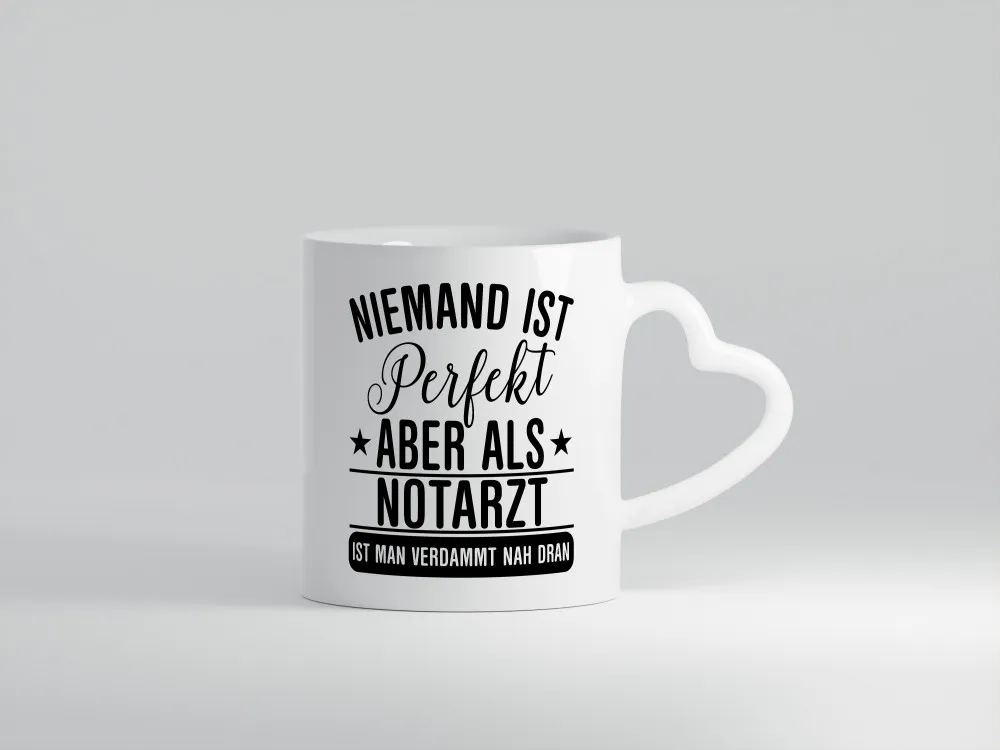 Verdammt nah dran: Notarzt | Arzt – Herzhenkel Tasse – Kaffeetasse / Geschenk / Familie