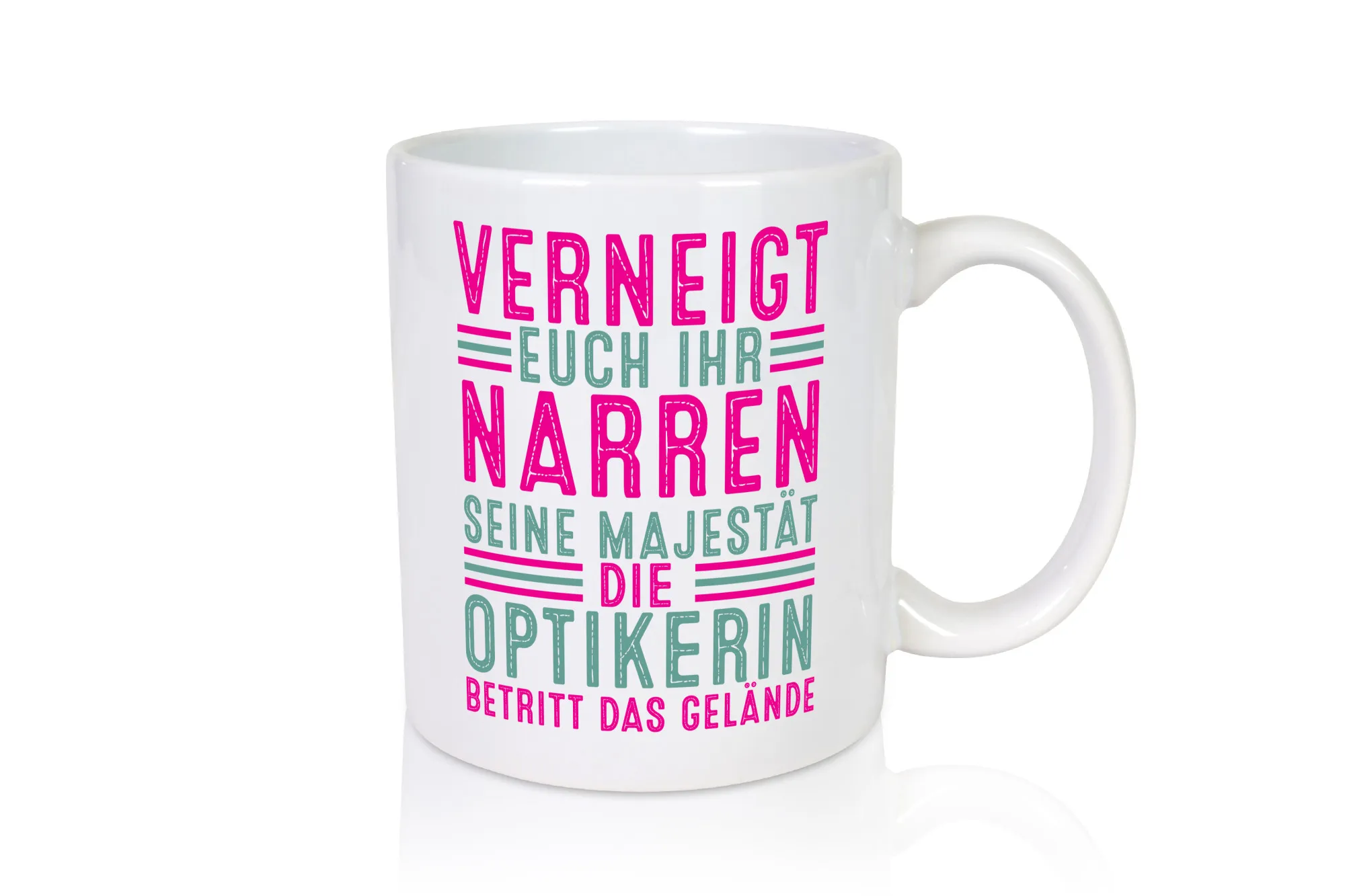 Verneigt euch: Optikerin | Augenoptik – Tasse Weiß – Kaffeetasse / Geschenk / Familie